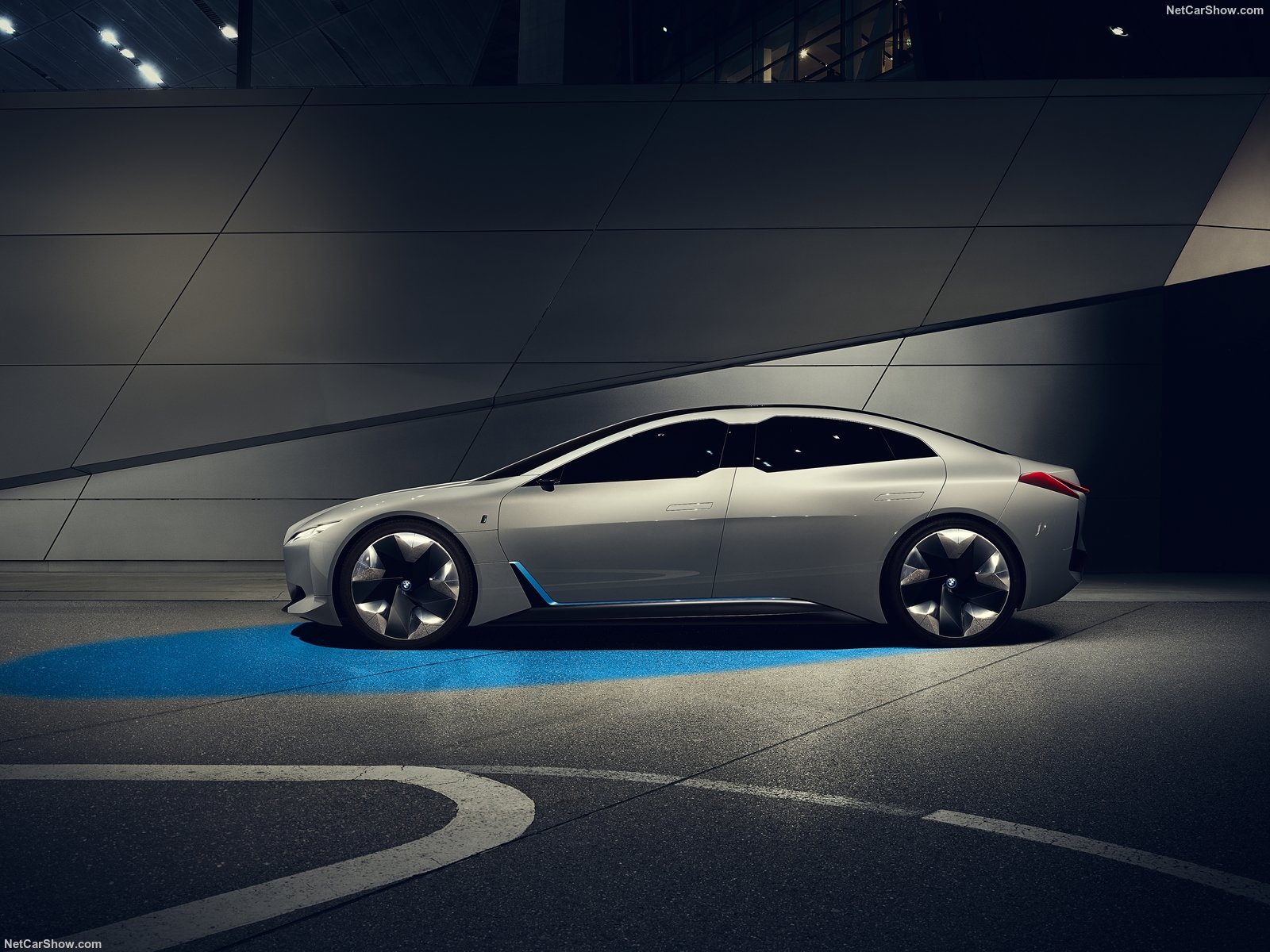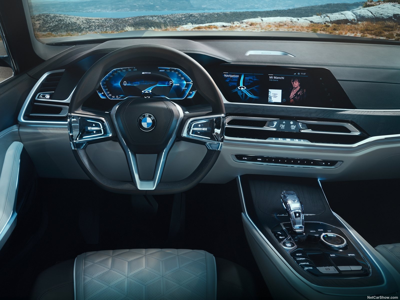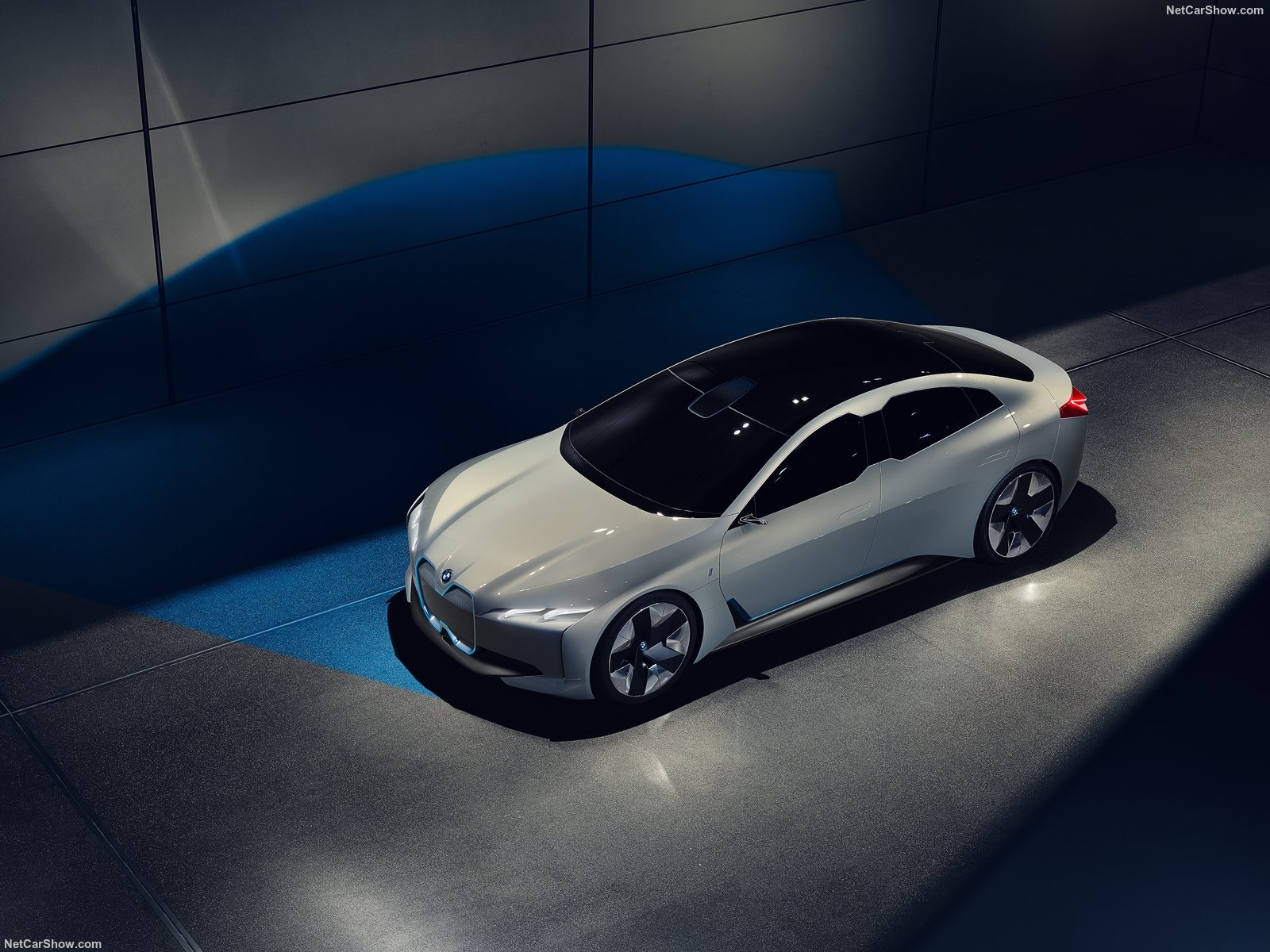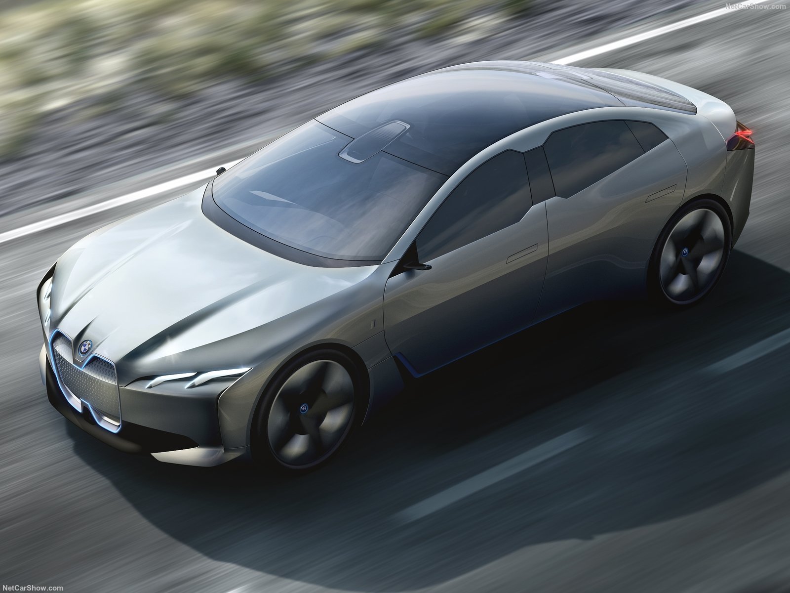 Pour l’esthétique, on retrouve certainement de plusieurs nouveaux codes stylistiques que l’on doit s’attendre à retrouver sur les modèles de série. Tout d’abord les optiques, qui abandonnent leurs signatures lumineuses en U, pour un retour aux sources. Autre élément marquant, la calandre devient pleine, s’étire jusqu’au bouclier, et les haricots sont encadrés d’un liseré bleu. Le design général privilégie la sobriété avec des galbes lissées, aux jeux de couleurs et matières extravagants des actuelles i3 et i8.